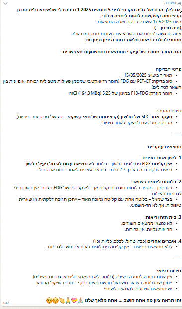 עדכון מצב, נעשה פט סיטי בסוף אוגוסט 2025, נמצאה נקייה, הטיפול התרופתי הופסק לפני חודשים, באה רק לבדיקות דם למעקב פעם בחודשים.